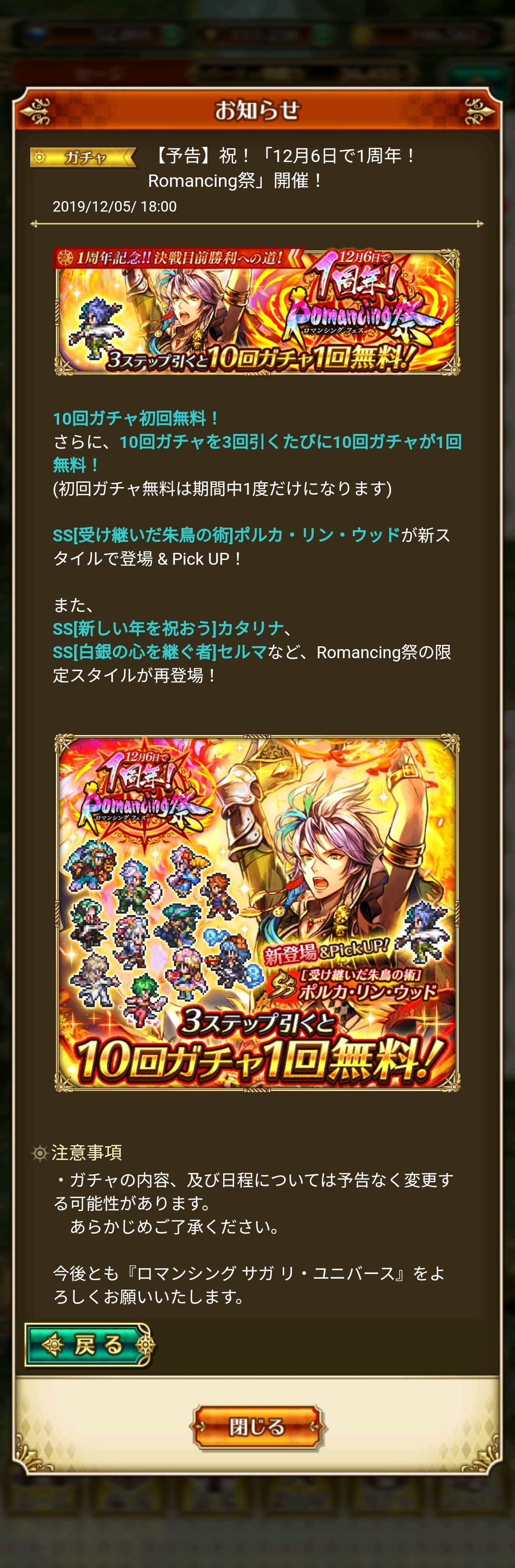 【ロマサガRS】ポルカガチャは初回10連とステップ毎に無料に。内容確認しておこう!※お知らせスクショしました。【リユニバース】